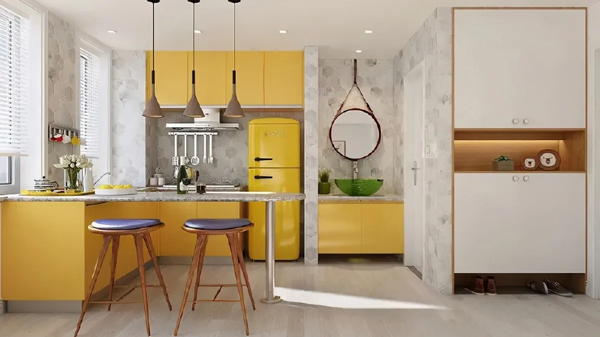 Dapur adalah area yang dekat dengan air, minyak, dan panas. Jadi, saat memilih desain mini bar dapur kecil, material top table dan finishing kabinet harus dipilih yang mudah dibersihkan dan tahan lama. Tampilan kayu hangat bisa dipadukan dengan top table solid yang kuat dan enak disentuh.